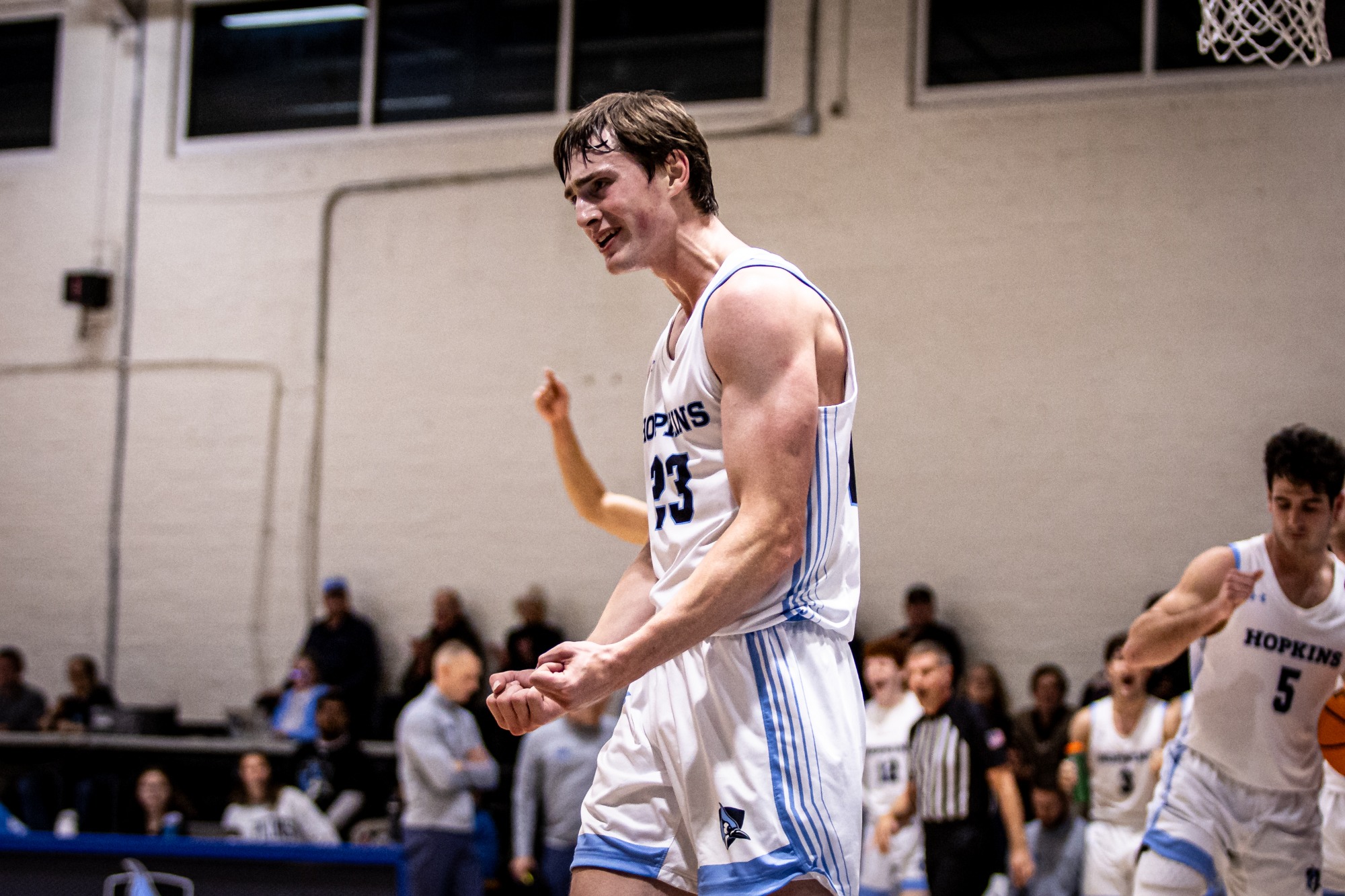 After a lay-up by Kamm, Navy's Francis Ebong scored and was fouled, but he missed the free throw that would have tied the game. JHU junior guard Kevin Marquez (Oakton, VA/Oakton) then hit one of two foul shots and Adams followed with a jumper, and after a Navy free throw Kamm hit a jumper to give Hopkins a 58-53 lead with 2:18 remaining.